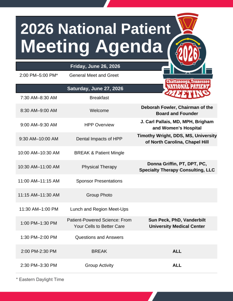Join us June 26-27 for an informative gathering where individuals and families affected by HPP can connect, share experiences, and learn directly from leading HPP experts. Check out our agenda for an overview of the planned events and speakers.