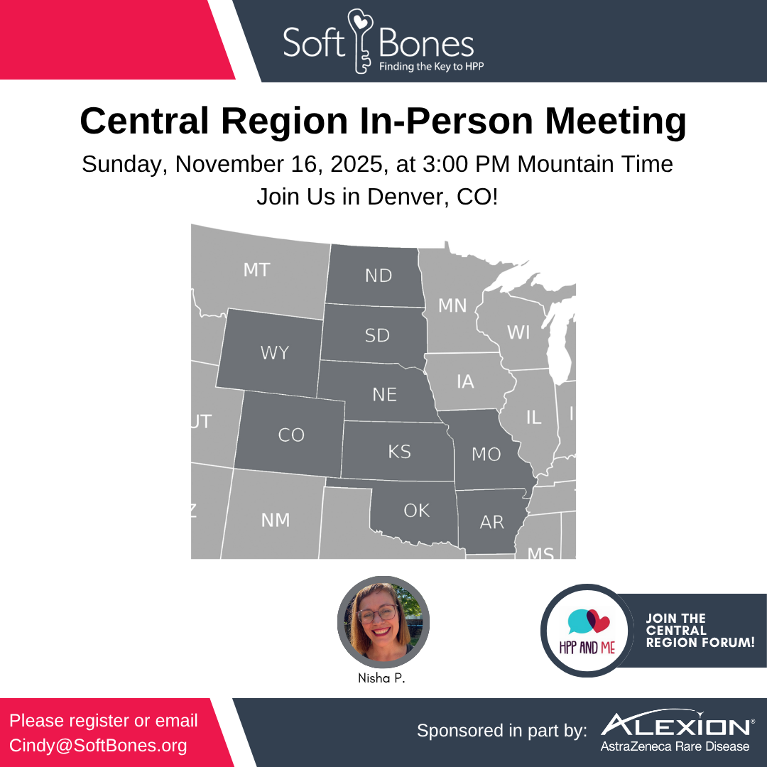 Soft Bones’s Region Lead, Nisha P., is hosting a Central Region Meeting on November 16, 2025. From 3-5 PM Mountain Time, connect with other members from your region. Refreshment will be provided. All Central Region members and their families are welcome to attend this local gathering. This is a time to connect and meet your local support system.