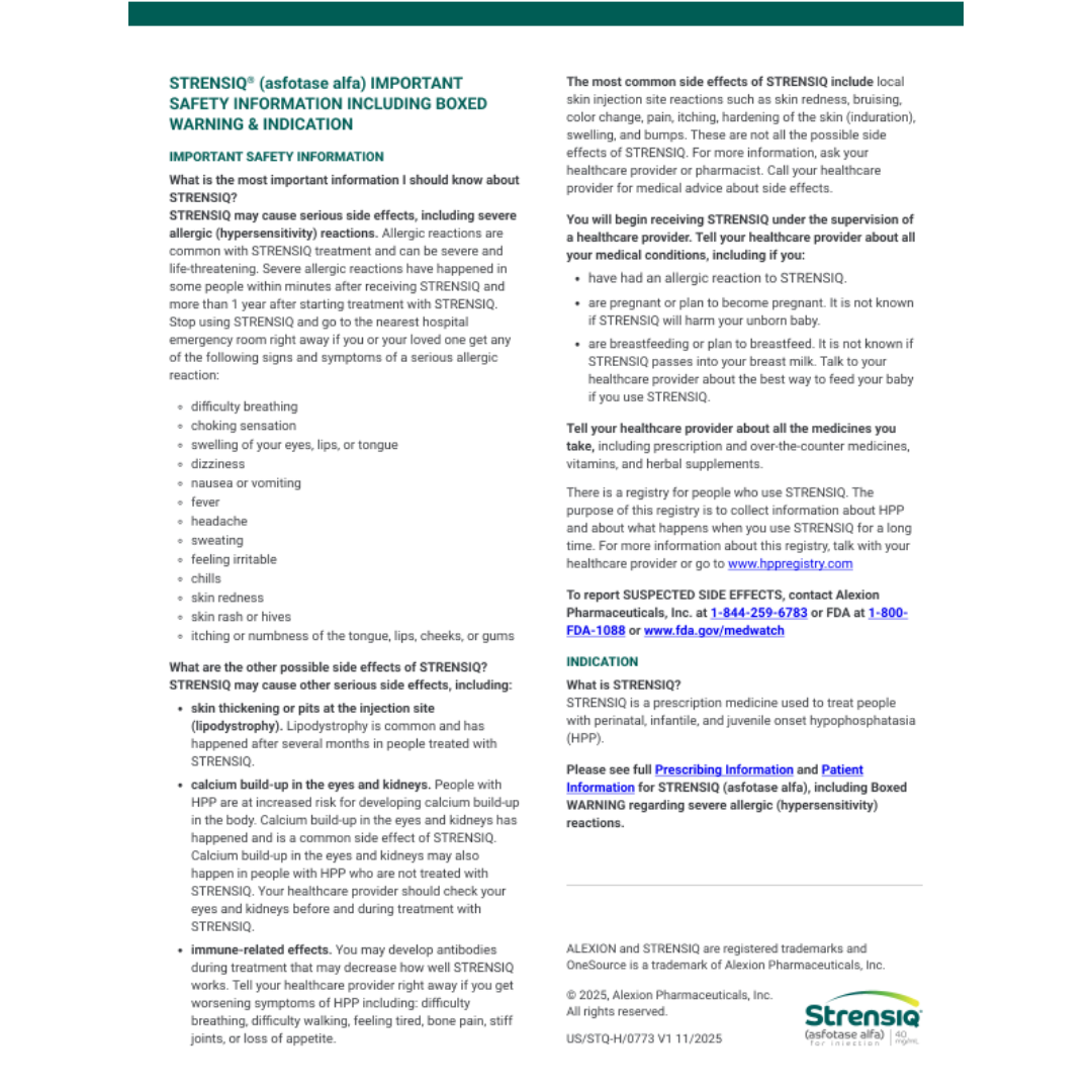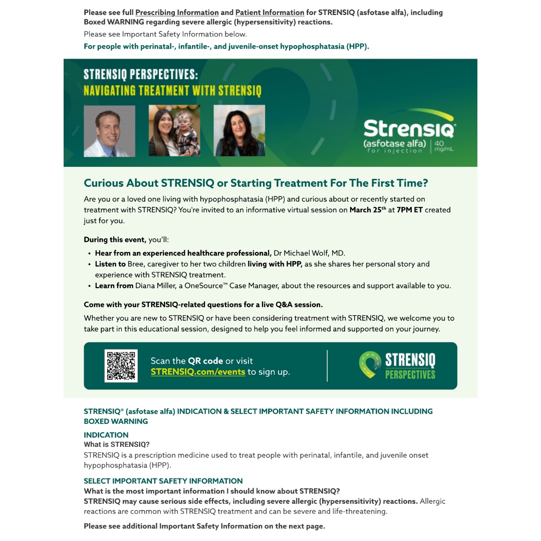 Join Alexion, AstraZeneca on March 25th at 7 PM Eastern for a virtual meeting. Learn more about STRENSIQ from an experienced HPP healthcare provider, HPP patient, or caregiver, and OneSource™ Case Manager. Registration is required. Please register below. https://strensiq.com/events