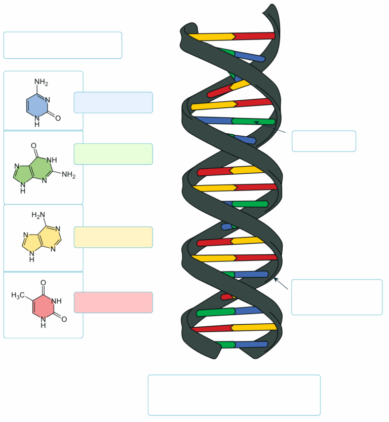 Genes are made up of combinations of nucleic acids: Adenine (A), Thymine (T), Cytosine (C) and Guanine (G). The genetic blueprint determines how these letters come together and form the DNA structure called the double helix, which resembles a twisted ladder. The order, or sequence, of these nucleic acids determines what biological instructions are contained in a strand of DNA, similar to how letters of the alphabet form words.