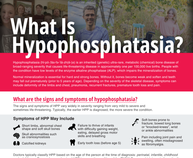 Hypophosphatasia is an inherited (genetic) ultra-rare, metabolic (chemical) bone disease of broad-ranging severity that causes life-threatening disease in approximately one per 100,000 live births. People with the condition have low levels of the enzyme alkaline phosphatase (ALP), which impairs the mineralization of bones.