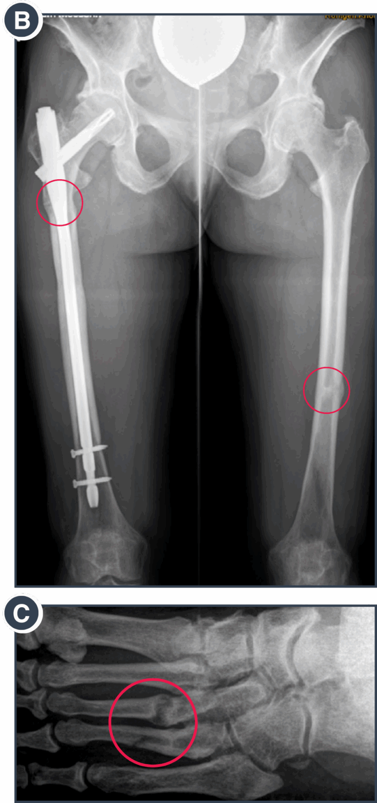 An accurate diagnosis is important for determining the optimal treatment strategy. Because HPP affects every person differently, symptoms and complications from the condition that require medical and/or surgical treatment need to be evaluated on a case-by-case basis. However, some common complications often occur within specific areas of the body. For example, bone-related complications such as fractures, pseudo-fractures, and bone bruises, typically affect the bones of the lower extremities, specifically the femur, tibia, and metatarsal bones. And, bone marrow lesions resulting from injury – or more frequently from repetitive strain in the context of everyday activities – are typically seen in short bones (those that are approximately equal in length, width, and thickness) or in those parts of long bones (those that are longer than they are wide) that are close to the joints.