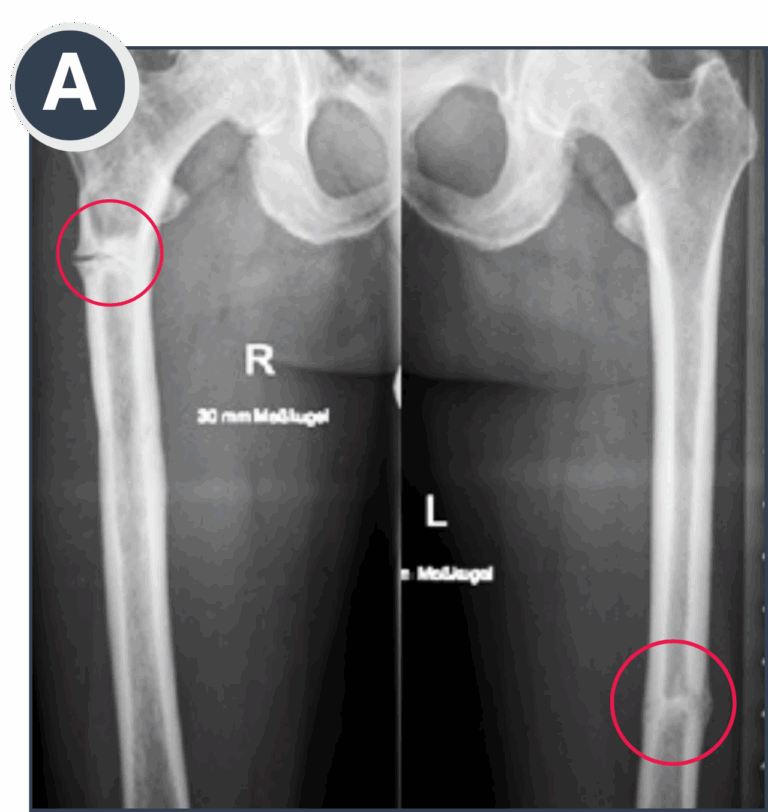 A: Bilateral femoral pseudo-fractures, progressed to almost complete fractures. Symptomatic and painful on the right side, while the left side was asymptomatic and a coincidental finding following thorough skeletal assessment.
