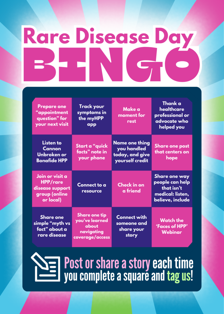 Join our Rare Disease Day Bingo Challenge and turn everyday moments into powerful advocacy. Post or share a story each time you complete a Bingo square and tag @SoftBonesHPP so we can reshare and cheer you on.